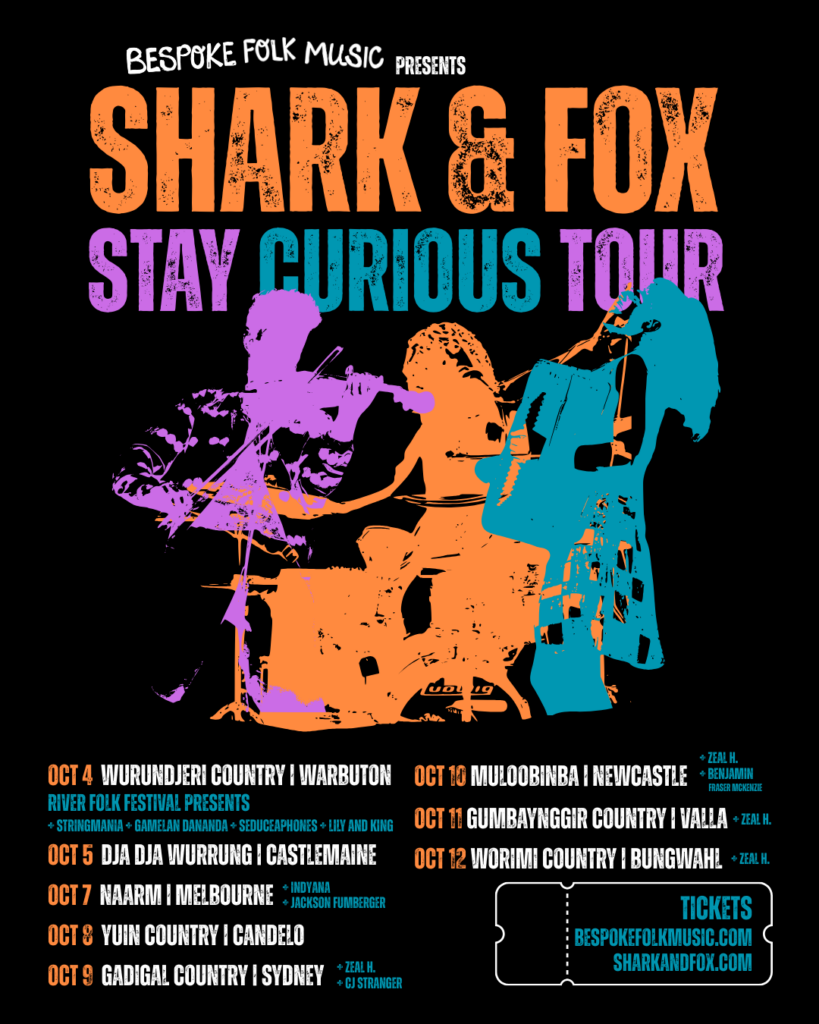 Three tours in the space of a year and a half is no small feat. This project has legs. Strange legs, beautiful legs, and ready to dance around the East Coast of Aus legs. YES Jaron is coming from Canada again – YES this is a bonkers endeavour. Show me that it’s worth it. Get thee to a show. Tickets are ON SALE. Head to SHARKANDFOX.COM to book yourself a night of freaky folk gone rogue – with Shark & Fox.